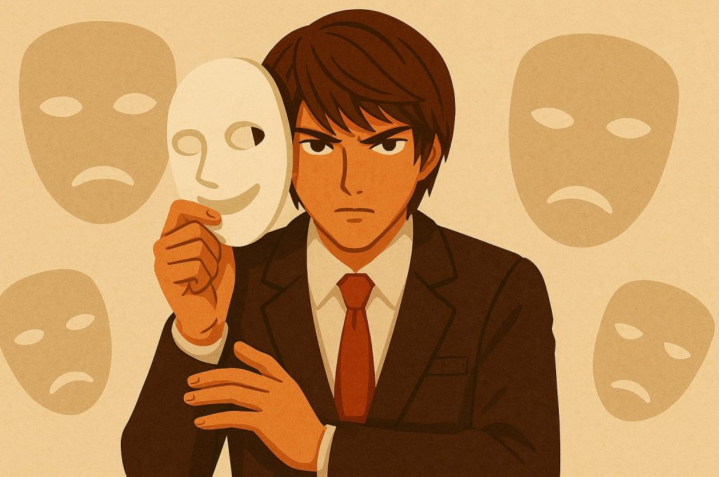 Light Yagami, misalnya, memulai perjalanannya sebagai siswa yang cerdas dan ambisius, tetapi ketika ia menemukan Death Note, ia mulai mengenakan topeng sebagai “Kira,” seorang dewa keadilan yang berusaha membersihkan dunia dari kejahatan. Dalam prosesnya, ia kehilangan sebagian dari kemanusiaannya dan menjadi terasing dari orang-orang terdekatnya. Hal ini mencerminkan bagaimana kita kadang-kadang mengorbankan hubungan dan nilai-nilai kita demi citra yang kita bangun. Ketika kita berusaha untuk memenuhi harapan orang lain, kita sering kali mengabaikan keinginan dan kebutuhan kita sendiri.